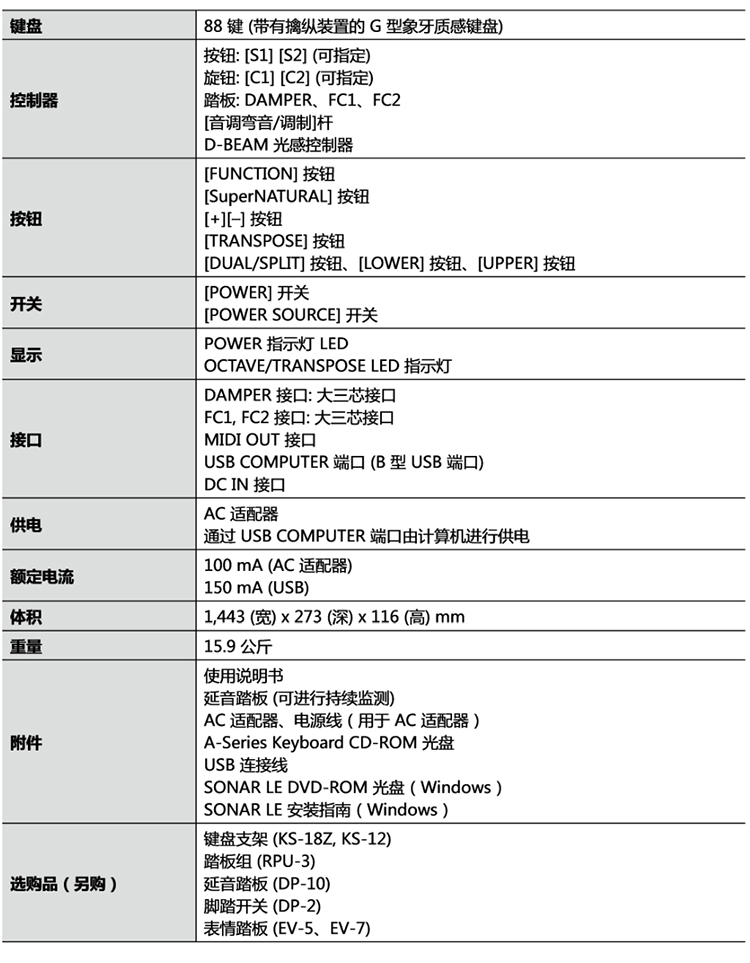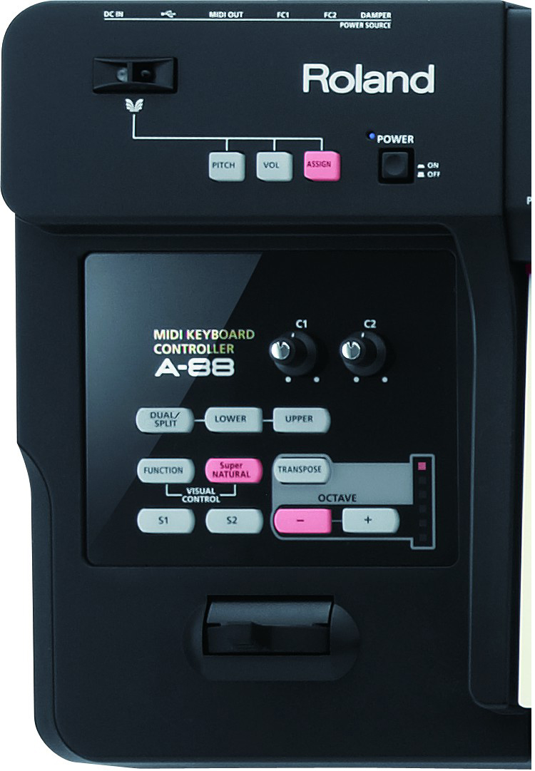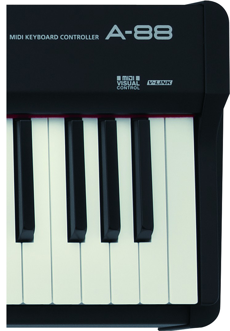 A- 88是完美的MIDI键盘,可以使虚拟钢琴软件、软件合成器和音源得到最有效的使用。嵌入式背面板提供了整齐的连接方式,使您可以将用于创作音乐的电脑监 视器或笔记本电脑放置在合适的位置。USB总线供电使设置整齐、简单。两个旋钮,两个切换器和D-BEAM控制器的操作都简单智能,使您的工作流程快速流 畅。通过Function按键可以进行其它设置,您可以使用按键执行键盘上方显示的其它任务。